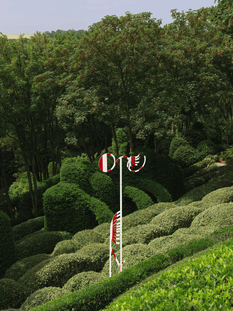 The series of kinetic sculptures razzle / d’oiseaux (1–3) draws inspiration from the wind that sweeps through the Gardens and the birds that inhabit them. Taking the form of weathervanes, the works nod to the Norman tradition while reinterpreting it in a bold, graphic manner, hovering between figuration and abstraction. Painted in deep oxblood red, their vertical stripes evoke both signaling codes and razzle dazzle naval camouflage (hence the title of the series, a play of words with “d'oiseaux” meaning birds in French). A visual tension emerges from the contrast between their sharp angles and the garden’s soft curves, heightened by the interplay of rigid aluminium and living plants.