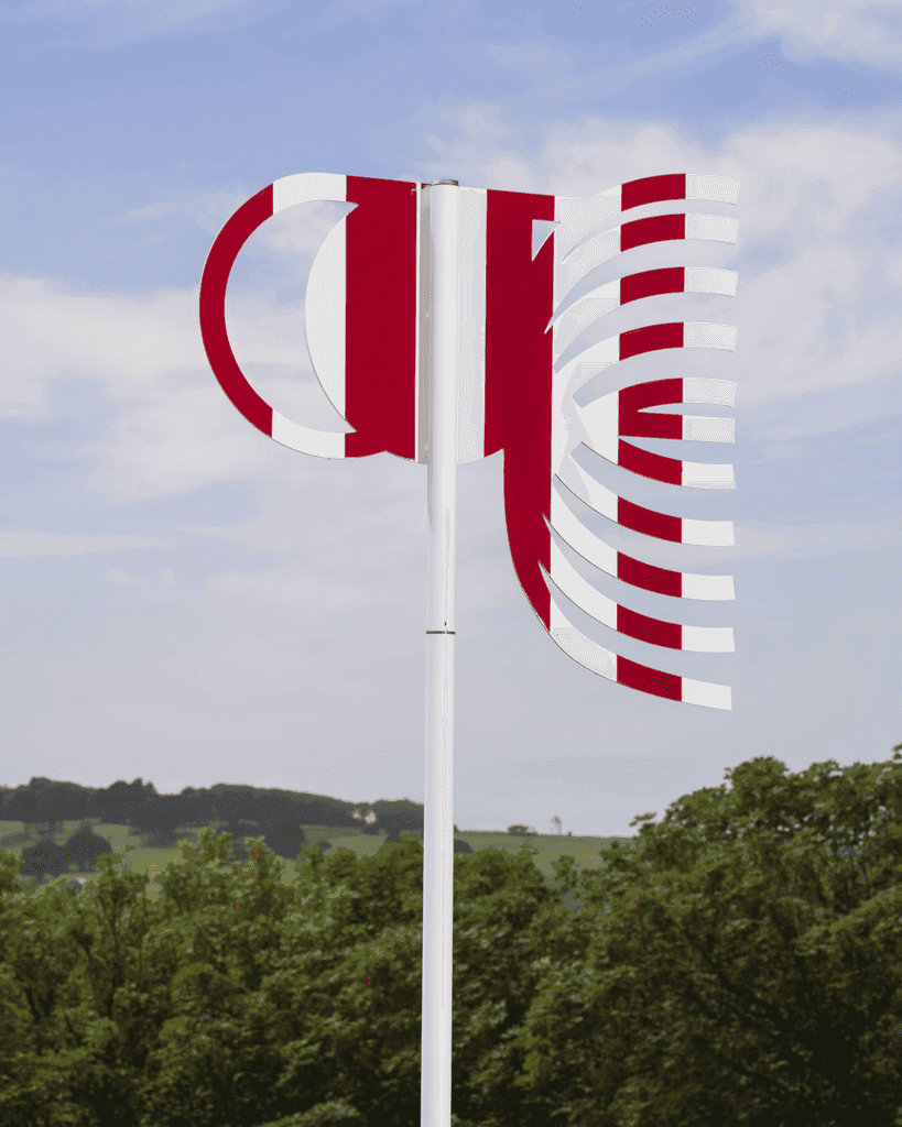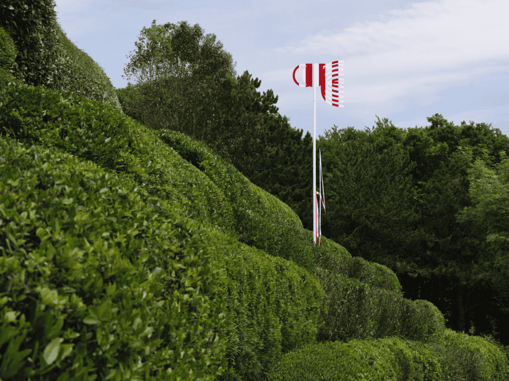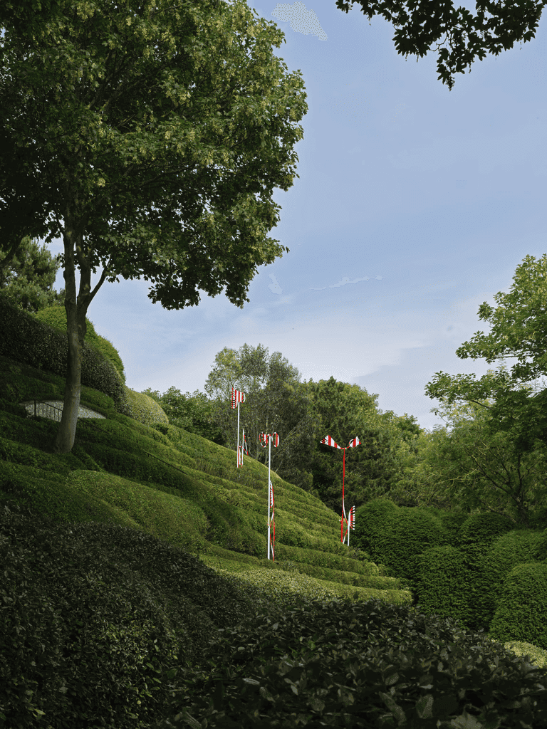 The series of kinetic sculptures razzle / d’oiseaux (1–3) draws inspiration from the wind that sweeps through the Gardens and the birds that inhabit them. Taking the form of weathervanes, the works nod to the Norman tradition while reinterpreting it in a bold, graphic manner, hovering between figuration and abstraction. Painted in deep oxblood red, their vertical stripes evoke both signaling codes and razzle dazzle naval camouflage (hence the title of the series, a game of words with “d'oiseaux” meaning birds in French). A visual tension emerges from the contrast between their sharp angles and the garden’s soft curves, heightened by the interplay of rigid aluminium and living plants.